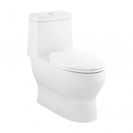 สุขภัณฑ์แบบชิ้นเดียวหน้ายาว แบบท่อน้ำทิ้งลงพื้น ระบบชำระล้างแบบ Siphonic Washdown ใช้น้ำเพียง 3/4.5 ลิตร พร้อมฝารองนั่งแบบกันกระแทก อุปกรณ์ประกอบหม้อน้ำ, ปุ่มกดชำระ, สายน้ำดี, วาล์วเปิด-ปิดน้ำ
