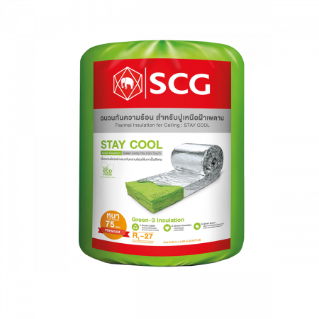 ฉนวนกันความร้อน เอสซีจี รุ่น STAY COOL ผลิตจากใยแก้ว ออกแบบมาสำหรับติดตั้งบริเวณเหนือฝ้าเพดาน ทั้งแบบฉาบเรียบและแบบ ที-บาร์ เพื่อป้องกันความร้อนที่มาทางโถงหลังคา ผ่านฝ้าเพดานลงมาสู่ภายในบ้าน